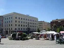 The Hämeenlinna Market Square (Finnish: Hämeenlinnan kauppatori) is the most significant town square in the city center of Hämeenlinna in Tavastia Proper, Finland, where most of the city's market square trade takes place. The market square is located in the Saaristenmäki district[1] on the same site where it was already located in the 1775 town plan. In the formula drawn up by C. L. Engel in 1832 after the Great Fire of Hämeenlinna, the market and the streets surrounding it remained in their old places.[2] The market square hosts many events and fairs, especially during the summer, and the monthly festival, for example, is held on the first Tuesday of each month. The market has also hosted concerts and other public events.