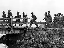 Marines cross a bridge in Agat during the liberation of Guam in 1944.