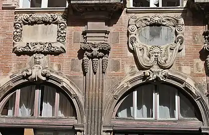 Historians are still debating the age of this emblematic portal of the Toulouse Renaissance: dated 1538 and attributed to Nicolas Bachelier for some, from the beginning of the 17th century and from the workshop of Pierre Souffron for others, a more recent publication now suggests the decade 1550 and a resemblance with engravings of the fireplaces of the Château de Madrid (destroyed).[2][3][4]