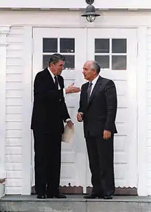Höfði (Icelandic pronunciation: [ˈhœvðɪ]) is a house in Reykjavík, Iceland, best known as the location for the 1986 Reykjavík Summit meeting of President Ronald Reagan of the United States and General Secretary Mikhail Gorbachev of the Soviet Union. This meeting was an important step towards ending of the Cold War. Within the building, the flags of the United States and the Soviet Union are cross-hung to commemorate the meeting.