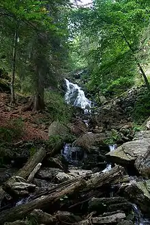This terrain hollow with extremely steep sides owes its formation to the last ice age. A mountain trail runs through the ancient forest here. Through a narrow, ravine the Höllbach rushes between, gneiss rocks as high as a house in places. On the northern boundary of the region it drops as a waterfall into the depths. The western part of the area is dominated by the Großer Falkenstein.