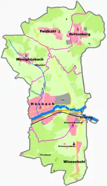 Hösbach has ten Ortsteile located on five Gemarkungen (traditional cadastral areas). These are as follows (population numbers for 2011):[3][4]