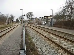 Højslev station is located on the Langå-Struer Line from Langå to Struer. The station was opened in 1864 with the opening of the Viborg-Skive section of the Langå-Struer Line.[3] It offers direct InterCity services to Copenhagen and Struer as well as regional train services to Aarhus and Struer. The train services are operated by Arriva and DSB.