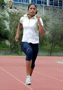 Hiriyur Manjunath Jyothi (born 1 July 1983)[1][2][3] is an Indian sprinter and Commonwealth games medalist. She competes in the 100 metres, 200 metres, and 4×100 metres relay categories. She is a national champion or former national champion in each of the three events, with personal best timings of 11.3[6] (or 11.46[7]), 23.42,[8] and 43.42[9] seconds in the 100 metres, 200 metres, and 4×100 metres relay, respectively. Her personal best times in all three events were after her withdrawal from professional competition for three years to become a mother. A Canara Bank employee,[6] Jyothi is married to the former sprinter S. Srinivas, who is also her personal coach.[4][5] Despite wanting to win a medal at Asian games, she couldn’t continue sprint due to persistent achilles injury. She ended up her career in 2017 with a gold at the open nationals, Chennai.