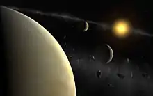![]() Artist's impression of the HD 69830 system as viewed from planet "d" (foreground). | |