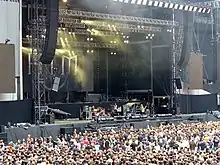 In February 2007, HIM began recording its sixth album at Finnvox Studios with producers Hiili Hiilesmaa and Tim Palmer.[109] The making-of the album was plagued with problems in Ville Valo's personal life. His alcohol abuse had worsened, which resulted in him vomiting and defecating blood at one point. Things came to a head when Valo suffered a nervous breakdown during the recording process. While he did manage to recover momentarily, he began drinking again during the mixing process. Eventually Valo was admitted to the Promises Rehabilitation Clinic in Malibu by the band's manager Seppo Vesterinen.[7] The album's release date was also pushed back from July to September 2007.[110] In April, HIM released Uneasy Listening Vol. 2, which peaked at number twelve in Finland.[111] From 25 July to 3 September 2007, HIM toured the US with Linkin Park on the Projekt Revolution Tour, which also included My Chemical Romance, Taking Back Sunday and Placebo.[112] Prior to the tour, HIM held a contest for fans to win a trip to meet them at the trek's opening date in Seattle. The winners of the contest would also be featured on a forthcoming live DVD.[113] In July, HIM played a number of concerts opening for Metallica, including a show at Wembley Stadium in London, England.[114]