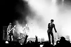 Much of HIM's success has been attributed to Ville Valo.[200] Along with his songwriting,[218] a key component in HIM's success was Valo's image, which Helsingin Sanomat described as utilizing "the tried and true James Dean formula, wherein sensitivity and edginess combined."[200] Metal Hammer described Valo as one of the few new "rockstars" of the early 2000s, stating: "HIM were like no other band. They had a special something, but more importantly they had a special someone. Ville shone like a star with his blend of Mick Jagger posturing and Brandon Lee's dark charms in The Crow".[222] Loudwire ranked Valo as the fourteenth greatest metal frontman of the 21st century, stating: "His baritone voice is undeniably gorgeous, his vampiric charisma is almost hypnotic, male fans desperately attempt to emulate him and female fans scream ballistically as if he was the second coming of Elvis."[223] Unlike other rock and metal bands, HIM also had a wide appeal,[11] with BMG's Asko Kallonen recalling: "For example in England it was hard to grasp. There the split was usually clear: hard rock was for guys, pop was for girls. HIM was listened to by both."[224] Tavastia Club owner Juhani Merimaa noted how the band's credibility in both the underground and mainstream, along with "melodic, catchy and good songs", paved the way for HIM to achieve major success.[11] PopMatters, meanwhile, noted how HIM is "not the sort of act that conjures up a lukewarm response [as] people either like them or discredit them outright".[225] Some of the major criticism directed towards the band have centered around the "formulaic" nature of its music and perceived "pandering" toward teenage goth fans.[53][192][225] HIM's association with Bam Margera has also received some negative feedback.[71]