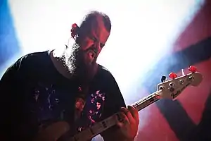 On 27 January 2015, Gas Lipstick announced his departure from HIM, after 16 years with the band. In his announcement, Gas stated: "There is no drama, bad blood or any negativity involved in my departure. I simply feel that it's time for me to move on as a musician."[166] HIM made its live debut following Gas's departure in July 2015, with a surprise show at the Qstock festival in Oulu, Finland. The show featured the debut of Gas' replacement, drummer Jukka "Kosmo" Kröger. Valo later stated that the band would begin work on a new album eventually, but no release date had been set.[167] On 5 December 2015, HIM performed at Knotfest in Toluca, Mexico, with Slipknot, Megadeth, and Lamb of God, among others.[168] In 2016, HIM took another hiatus, during which the band members focused on their various side projects.[169] Because of this, the 2016 edition of Helldone was cancelled.[170]