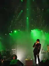 In January 1999, HIM began demoing material for its next album with Hiili Hiilesmaa.[27] These sessions proved to be unsuccessful, however, and the band decided to relocate to Rockfield, Wales with producer John Fryer.[7][27] In November 1999, HIM released the single "Join Me in Death", which charted at number one in Finland and Germany.[28][29] The single would eventually go platinum in Finland, as well as gold in Germany and Austria.[22][30][31] At the 1999 Emma Gala, HIM were named Export of the Year.[23] On 31 December 1999, the band performed at the Tavastia Club in Helsinki, Finland, which turned into a New Year's tradition for the group.[32] HIM's second album Razorblade Romance was released on 24 January 2000.[33] It peaked at number one in Finland, Austria and Germany.[34][35][36] The album would eventually be certified double platinum in Finland, triple gold in Germany, as well as gold in Austria.[22][30][31] Four more singles were released, all of which reached the top five on the Finnish Singles Chart. Razorblade Romance was mostly well received by critics. Soundi gave the album four out of five stars, while Blabbermouth.net called it "yet another amazingly crafted album from Europe's best-kept secret."[37][38] At the 2000 Emma Gala, HIM was named Band of the Year and Razorblade Romance Album of the Year. The group also received the Viewers' Choice Award and the Video of the Year award for "Join Me in Death" at the 2000 VIVA Comet Awards.[23][39] During the supporting tour for Razorblade Romance, HIM played its first shows in the United Kingdom.[7][40] As the tour progressed, however, the band began to feel exhausted. They were also hit with several near-fatal accidents, where Valo nearly fell off a balcony and Salminen ended up in the emergency room after a prank gone wrong.[41] By the band's own account, HIM nearly broke up, though they eventually regrouped and began rehearsing for another album.[42]