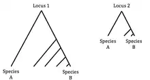 A test that suggests selection: Again suppose you have data as in the last example, only this time locus 2 has equal divergence to locus 1 and yet lower polymorphism in species B. In this case the rate of mutation in each locus is equal, so this can only be explained by a reduction in the effective population size Ne of species B, which is inferred as an act of selection.