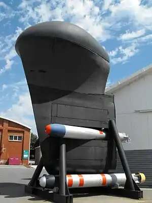 The main armament of the Oberons consisted of six 21-inch (533.4 mm) torpedo tubes.[1] The British Mark 8 torpedo was initially carried by the submarine; this was later replaced by the wire-guided Mark 23.[8] During the 1980s, the Australian Oberons were upgraded to carry United States Navy Mark 48 torpedoes and UGM-84 Sub Harpoon anti-ship missiles.[5] As of 1996, the standard payload of an Australian Oberon was a mix of 20 Mark 48 Mod 4 torpedoes and Sub Harpoon missiles.[6] Some or all of the torpedo payload could be replaced by Mark 5 Stonefish sea mines, which were deployed through the torpedo tubes.[6][8] On entering service, two stern-mounted, short-length 21-inch (53 cm) torpedo tubes for Mark 20 anti-submarine torpedoes.[9] However, the development of steerable wire-guided torpedoes made the less-capable aft-firing torpedoes redundant; they were closed off, and later removed during a refit.[9]