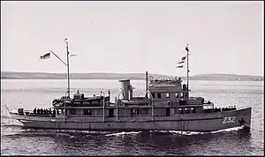 Ambler was requisitioned in May 1940 and commissioned on 6 May 1940 at Midland, initially carrying the pennant number Q11 and later Z32.[1][2] The vessel was sent to Quebec City where she was the second ship to be converted to an armed yacht and had her armament installed.[1][5] Ambler's initial posting was as a patrol ship in the Gulf of St. Lawrence and St. Lawrence River. She remained there until October 1941 when the ship was transferred to Halifax and used as a tender ship to HMCS Stadacona. In 1942 she was transferred to HMCS Cornwallis as a training ship and remained there for the rest of the war. Ambler was paid off on 20 July 1945 and placed in reserve at Sydney, Nova Scotia.[1] The vessel was put up for disposal on 31 January 1946, and in 1947 Ambler was sold to Greek interests.[1][6]