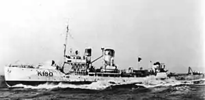 Flower-class corvettes like Collingwood serving with the Royal Canadian Navy during the Second World War were different from earlier and more traditional sail-driven corvettes.[3][4][5] The "corvette" designation was created by the French as a class of small warships; the Royal Navy borrowed the term for a period but discontinued its use in 1877.[6] During the hurried preparations for war in the late 1930s, Winston Churchill reactivated the corvette class, needing a name for smaller ships used in an escort capacity, in this case based on a whaling ship design.[7] The generic name "flower" was used to designate the class of these ships, which – in the Royal Navy – were named after flowering plants.[8]