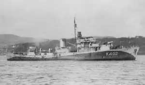 HMCS Giffard was a modified Flower-class corvette that served with the Royal Canadian Navy during the Second World War. She served primarily as a convoy escort in the Battle of the Atlantic. She was originally laid down by the British Royal Navy as HMS Buddleia but was never commissioned into the former, being transferred to the Royal Canadian Navy before completion.[2] She is named for Giffard, Quebec, which at the time was a small village, but was eventually amalgamated into first, Beauport Quebec and then finally, Quebec City.[3]