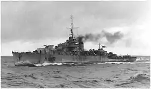 The River-class frigate was designed by William Reed of Smith's Dock Company of South Bank-on-Tees. Originally called a "twin-screw corvette", its purpose was to improve on the convoy escort classes in service with the Royal Navy at the time, including the Flower-class corvette. The first orders were placed by the Royal Navy in 1940 and the vessels were named for rivers in the United Kingdom, giving name to the class. In Canada they were named for towns and cities though they kept the same designation.[5] The name "frigate" was suggested by Vice-Admiral Percy Nelles of the Royal Canadian Navy and was adopted later that year.[6]