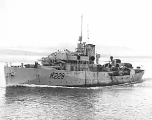 New Westminster was laid down 4 February 1941 by Victoria Machinery Depot Co. Ltd. at Victoria, British Columbia and launched 14 May 1941. She was commissioned 31 January 1942 at Victoria.[9] During her career, New Westminster had two major refits. The first significant overhaul took place at Sydney, Nova Scotia from May 1943 until 10 December 1943. During this refit she had her fo'c'sle extended. Her second major refit took place at Saint John from January to March 1945.[10]