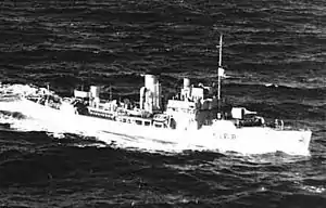 Flower-class corvettes like The Pas serving with the Royal Canadian Navy during the Second World War were different from earlier and more traditional sail-driven corvettes.[4][5][6] The "corvette" designation was created by the French in for classes of small warships; the Royal Navy borrowed the term for a period but discontinued its use in 1877.[7] During the hurried preparations for war in the late 1930s, Winston Churchill reactivated the corvette class, needing a name for smaller ships used in an escort capacity, in this case based on a whaling ship design.[8] The generic name "flower" was used to designate the class of these ships, which – in the Royal Navy – were named after flowering plants.[9]