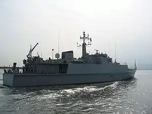 ![]() HMS Bangor sweeping Southampton Water in preparation for the International Fleet Review 2005. | |