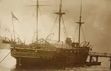 HMS Calliope was a Calypso-class corvette (later classified as a third-class cruiser) of the Royal Navy of the United Kingdom which served from 1887 until 1951. Exemplifying the transitional nature of the late Victorian navy, Calliope was a sailing corvette—the last such ship built for the Royal Navy—but supplemented the full sail rig with a powerful engine. Steel was used for the hull, and like the earlier iron-hulled corvettes, Calliope was cased with timber and coppered below the waterline, in the same manner as wooden ships.[4]