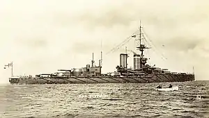 Between 17 and 20 July 1914, Centurion took part in a test mobilisation and fleet review as part of the British response to the July Crisis. Arriving in Portland on 25 July, she was ordered to proceed with the rest of the Home Fleet to Scapa Flow four days later[15] to safeguard the fleet from a possible surprise attack by the Imperial German Navy.[16] In August 1914, following the outbreak of the First World War, the Home Fleet was reorganised as the Grand Fleet, and placed under the command of Admiral Sir John Jellicoe.[17] Repeated reports of submarines in Scapa Flow led Jellicoe to conclude that the defences there were inadequate and he ordered that the Grand Fleet be dispersed to other bases until the defences be reinforced. On 16 October the 2nd BS was sent to Loch na Keal on the western coast of Scotland. The squadron departed for gunnery practice off the northern coast of Ireland on the morning of 27 October and her sister Audacious struck a mine, laid a few days earlier by the German auxiliary minelayer SS Berlin. Thinking that the ship had been torpedoed by a submarine, the other dreadnoughts were ordered away from the area, while smaller ships rendered assistance. On the evening of 22 November 1914, the Grand Fleet conducted a fruitless sweep in the southern half of the North Sea; Centurion stood with the main body in support of Vice-Admiral David Beatty's 1st Battlecruiser Squadron. The fleet was back in port in Scapa Flow by 27 November.[18]