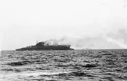 Courageous served with the Home Fleet at the start of World War II with 811 and 822 Squadrons aboard, each squadron equipped with a dozen Fairey Swordfish.[38] In the early days of the war, hunter-killer groups were formed around the fleet's aircraft carriers to find and destroy U-boats. On 31 August 1939 she went to her war station at Portland and embarked the two squadrons of Swordfish. Courageous departed Plymouth on the evening of 3 September 1939 for an anti-submarine patrol in the Western Approaches, escorted by four destroyers.[34] On the evening of 17 September 1939, she was on one such patrol off the coast of Ireland. Two of her four escorting destroyers had been sent to help a merchant ship under attack and all her aircraft had returned from patrols. During this time, Courageous was stalked for over two hours by U-29, commanded by Captain-Lieutenant Otto Schuhart. The carrier then turned into the wind to launch her aircraft. This put the ship right across the bow of the submarine, which fired three torpedoes. Two of the torpedoes struck the ship on her port side before any aircraft took off, knocking out all electrical power, and she capsized and sank in 20 minutes with the loss of 519 of her crew, including her captain.[39] The survivors were rescued by the Dutch ocean liner Veendam and the British freighter Collingworth. The two escorting destroyers counterattacked U-29 for four hours, but the submarine escaped.[40]
