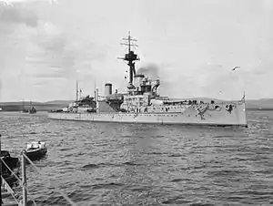 Between 17 and 20 July 1914, Hercules took part in a test mobilisation and fleet review as part of the British response to the July Crisis. Arriving in Portland on 25 July, she was ordered to proceed with the rest of the Home Fleet to Scapa Flow four days later[13] to safeguard the fleet from a possible surprise attack by the Imperial German Navy.[14] In August 1914, following the outbreak of World War I, the Home Fleet was reorganised as the Grand Fleet, and placed under the command of Jellicoe.[15] Most of it was briefly based (22 October to 3 November) at Lough Swilly, Ireland, while the defences at Scapa were strengthened. On the evening of 22 November 1914, the Grand Fleet conducted a fruitless sweep in the southern half of the North Sea; Hercules stood with the main body in support of Vice-Admiral David Beatty's 1st Battlecruiser Squadron. The fleet was back in port in Scapa Flow by 27 November.[16] The 1st Battle Squadron cruised north-west of the Shetland Islands and conducted gunnery practice on 8–12 December. Four days later, the Grand Fleet sortied during the German raid on Scarborough, Hartlepool and Whitby, but failed to make contact with the High Seas Fleet. Hercules and the rest of the Grand Fleet conducted another sweep of the North Sea on 25–27 December.[17]