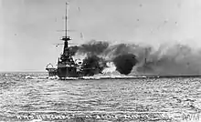 On 31 May, Hercules, now under the command of Captain Lewis Clinton-Baker, was the twenty-third ship (or second from the rear) from the head of the battle line after deployment as part of the 6th Division of the 1st BS.[13] During the first stage of the general engagement, the ship was straddled by five shells fired by a German dreadnought at 18:16.[Note 1] Shortly afterward, she fired at the crippled light cruiser SMS Wiesbaden around 18:20. Hercules engaged a German dreadnought beginning at 18:25 with seven or eight salvos of her own. The poor visibility greatly hampered her return fire and was a problem for the entire battle. At 19:12, the ship opened fire at the battlecruiser SMS Seydlitz, and probably scored two hits. One of her high-explosive (HE) shells penetrated through the upper superstructure and caused minor splinter damage. The second HE shell burst on hitting the upper hull armour, which dished in the armour plates and caused moderate flooding. About five to ten minutes later, she engaged several German destroyer flotillas with a few salvos from her main armament without result. Hercules was then forced to turn away to avoid several torpedoes, one of which was believed to have passed very close. Marlborough, flagship of the division, was hit by a torpedo and forced to reduce speed, which caused the division to fall behind the main body of the Grand Fleet. They did not rejoin until the afternoon of 1 June, as the fleet was headed for home. Hercules received no damage and fired a total of 98 twelve-inch shells (82 HE, 4 armour-piercing, capped, and 12 common pointed, capped) and 15 shells from her four-inch guns during the battle.[23]