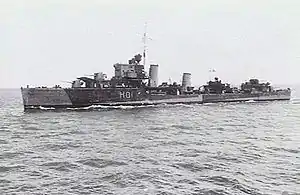 HMS Hotspur was an H-class destroyer built for the Royal Navy during the 1930s. During the Spanish Civil War of 1936–1939 the ship spent considerable time in Spanish waters, enforcing the arms blockade imposed by Britain and France on both sides of the conflict. During the Norwegian Campaign of the Second World War, she fought in the First Battle of Narvik in April 1940 where she was badly damaged. After her repairs were completed, Hotspur was transferred to Gibraltar where she participated in the Battle of Dakar in September. A month later the ship was badly damaged when she rammed and sank an Italian submarine. She received permanent repairs in Malta and was transferred to the Mediterranean Fleet when they were finished in early 1941. Hotspur participated in the Battle of Cape Matapan in March and evacuated British and Australian troops from both Greece and Crete in April–May. In June the ship participated in the Syria-Lebanon Campaign and was escorting convoys and the larger ships of the Mediterranean Fleet until she was transferred to the Eastern Fleet in March 1942.
