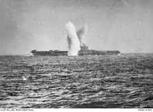 While her steering was being repaired in Malta, the Illustrious was bombed again on 16 January by 17 Junkers Ju 88 medium bombers and 44 Stukas. The pilots of 806 Squadron claimed to have shot down two of the former and possibly damaged another pair, but a 500 kg bomb penetrated her flight deck aft of the rear lift and detonated in the captain's day cabin; several other bombs nearly hit the ship but only caused minor damage. Two days later, one of three Fulmars that intercepted an Axis air raid on the Maltese airfields was shot down with no survivors. Only one Fulmar was serviceable on 19 January, when the carrier was attacked several times and it was shot down. Illustrious was not struck during these attacks but was near-missed several times and the resulting shock waves from their detonations dislodged enough hull plating to cause an immediate 5-degree list, cracked the cast-iron foundations of her port turbine, and damaged other machinery.[53][54] The naval historian J. D. Brown noted that "There is no doubt that the armoured deck saved her from destruction; no other carrier took anything like this level of punishment and survived."[55]