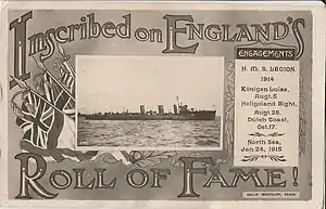 She was attached to the Harwich Force and served in the North Sea. The ship saw action in several engagements, including the Battle off Texel. Legion was severely damaged by a German mine on 10 November 1916. It was decided to convert Legion to allow use for minelaying while under repair. Rails were fitted to allow the carrying of up to 40 mines.[7][8]