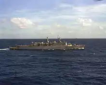 A twin launcher for the Seaslug anti-aircraft missile was fitted aft.[6] The Seaslug GWS1 was a beam riding missile which had an effective range of about 19 mi; 31 km.[7] Up to 39 Seaslugs could be carried horizontally in a magazine that ran much of the length of the ship.[8][9] Close-in anti-aircraft protection was provided by a pair of Seacat (missile) launchers, while two twin QF 4.5 inch Mark V gun mounts were fitted forward. A helicopter deck and hangar allowed a single Westland Wessex helicopter to be operated.[2]