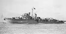 The ship's main gun armament was six 4 inch (102 mm) QF Mk XVI dual purpose (anti-ship and anti-aircraft) guns in three twin mounts, with one mount forward and two aft. Additional close-in anti-aircraft armament was provided by a quadruple 2-pounder "pom-pom" mount and two single Oerlikon 20 mm cannon mounted in the bridge wings.[9][10] Power-operated twin 20 mm Oerlikon mounts replaced the single Oerlikons during the war.[11] Up to 110 depth charges could be carried.[12][13][lower-alpha 2] The ship had a complement of 168 officers and men.[7][9]