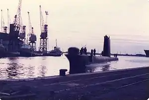 Otter was laid down by Scotts Shipbuilding and Engineering Company on 14 January 1960, and launched on 15 May 1961.[2] The boat was commissioned into the Royal Navy on 20 August 1962.[2] The only Oberon class submarine fitted with a mild steel casing needed when deployed as target for practice torpedo attacks.