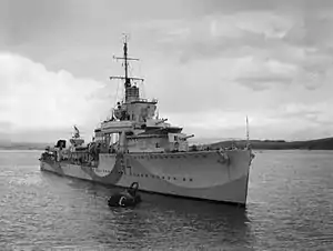 She was propelled by three Yarrow water tube boilers powering Brown-Curtis geared steam turbines developing 27,000 SHP driving two screws for a maximum designed speed of 34 knots. She was oil-fired and had a bunkerage of 320 to 370 tons. This gave a range of between 3500 nautical miles at 15 knots and 900 nautical miles at 32 knots.[2]