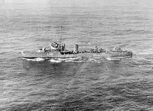 ![]() HMS Woolston underway in April 1940 after her conversion to a long range convoy escort | |