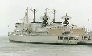 Van Kinsbergen's main anti-aircraft armament was an 8-round NATO Sea Sparrow surface-to-air missile launcher in front of the bridge. An OTO Melara 76 mm was fitted forward of the Sea Sparrow launcher, while a Goalkeeper CIWS was planned to be fitted aft, on the roof of the ship's hangar. Goalkeeper was not available when the ships were built, however, and Van Kinsbergen was completed with a Bofors 40 mm L/60 anti-aircraft gun in its place. Eight Harpoon anti-ship missiles could be carried in two quadruple launchers, although two or four Harpoons was a more normal peacetime load-out. A hangar and fight deck were fitted to accommodate two Westland Lynx helicopters, although only one was normally carried. Close-in anti submarine armament was provided by four 324 mm tubes for US Mark 46 torpedoes.[1][4] A Signaal LW-08 long-range air search radar was fitted, together with a ZW-06 surface-search radar, with WM-25 and STIR-180 fire control radars to direct the ship's armament. A Canadian SQS-505 hull-mounted sonar was fitted.[1][5]