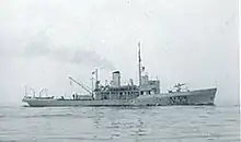 After the German capture of Horten the surrendered Norwegian vessels were pressed into Kriegsmarine service. Rauma was repaired and recommissioned as Kamerun on 18 April 1940.[3] Kamerun first served as a Vorpostenboot in the Hafenschutzflotille Oslo, later being converted into a minelayer.[4] Kamerun spent her entire war in Norway and was part of the German Mine Sweeping Administration (GM-SA) after the German surrender in 1945.[1]