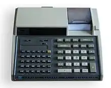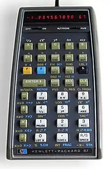 The HP-67 is a magnetic card-programmable handheld calculator, introduced by Hewlett-Packard in 1976 at an MSRP of $450.[1] A desktop version with built-in thermal printer was sold as the HP-97 at a price of $750.[2]