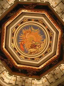 Near the ceiling of the octagonal entrance hall of the bank building were originally eight mosaic murals. The dome was decorated with frescos depicting the twelve signs of the zodiac, eight geometric shapes and eight lions, as well Apollo, Luna and Fortuna. An enterprising architect had the mosaics covered over in stucco and paint to save them in 1956. When the Soviet Navy decided to visit Shanghai in next year, the building was selected as a guest house, but the mosaics becames the controversy, some people criticized these mosaics were "too commercialized" and "too Westernized" and thus suggested to destruct them. The president of the Shanghai Civil Architecture Institute, Chen Zhi (陈植), reviewed the mosaics and opposed to destruct, instead he proposed to cover them up, and his proposal was approved by government.[5][6] In 1997, the mosaics were rediscovered, renovations uncovered them. The Pudong Development Bank then funded the restoration, but changed the HSBC emblems in the paintings to the Pudong Development Bank emblem.