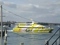 From early autumn 2009, Wightlink took delivery of two new vessels to operate the route, Wight Ryder I and Wight Ryder II.[3] Both the FastCat Shanklin and FastCat Ryde were retained by Wightlink until 2010, due to teething problems which occurred with the new vessels.[4] They were then sold on to new owners Severn Link. In January 2010, the FastCat Shanklin was re-painted into a new livery for use with Severn Link travelling between Ilfracombe and Swansea as part of a new catamaran service with a shorter travel time of 50 minutes. The re-paint occurred in Portsmouth Harbour and shortly afterwards the ferry departed for Swansea. On 29 January 2010 the ship arrived in the Bristol Channel and visited Ilfracombe before heading to Swansea Docks.[5] After arriving there it received an interior refurbishment.[6] However the proposed ferry service failed to start as stated by Severn Link at Easter 2010.