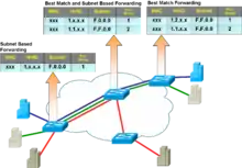 A further example (see diagram) shows HVLAN operation in the case of point-to-multipoint services (e.g. IPTV). The diagram shows all forwarding table entries needed to transport the 2 multipoint services (red and blue) from a server (left) to 3 clients (right).