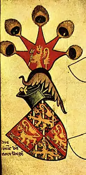 In 1363, former members of the Swedish Council of the Realm, led by Bo Jonsson Grip, arrived at the court in the Duchy of Mecklenburg-Schwerin.[2][20][21] The Swedish noblemen promptly persuaded Duke Albert II of Mecklenburg, who had gained influence in the affairs of Sweden by marrying Magnus' sister Euphemia,[2][22][23] to intervene against Magnus and Haakon in Sweden and depose them both in favour of his and Euphemia's son Albert.[2][24] In 1364, Duke Albert enlisted military support from several powerful North German noblemen and proceeded to swiftly invade and conquer Sweden and subsequently installed his son as the new king.[2][25] In November 1365, the younger Albert was formally hailed as Sweden's new king, though he had already been crowned on 18 February 1364.[2][3][20] Magnus sought refuge with his son in Norway where they immediately planned the reconquest of Sweden.[26][27] After an invasion, a temporary truce was established between the two warring parties, and though Haakon and Magnus had lost control over much of Sweden, they still maintained control over the important provinces of Västergötland, Dalsland and Värmland.[28]