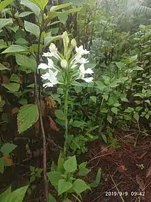 Habenaria dentata is a species of orchid native to the Himalaya, China, India, Indochina, Thailand and Myanmar. It is also found at Phalee.[1] The whole plant is about 35 to 80 cm in height. It has a smooth round tuber that give rise to a single plant. Lower part of stem sheathed, middle leafy and upper part bracteate. Leaves 4 to 6 cm long, oblong to elliptic, 5 nerved, sometimes 7 also, the base of the leaf narrowed into a long tubular sheath. Spike 4 to 8 cm long, laxly flowered. Sepals sub-equal, broadly ovate, acute, spreading, the lateral pair sub-erect. Petals narrowly oblong, sub-acute, curved inwards, shorter than the sepals. Lip as long as the sepals, variable in breadth, with large cuneate or rounded, fimbriate or crenate side lobes and a small oblong entire apical lobe. Spur infundibuliform at the base, slender laterally compressed, geniculte, sub-clavate below the knee, longer than the shortly stalked beaked ovary. Stigmas separated by the area in the centre by the orifice of the spur.[2] It generally blooms in August- September.[3]