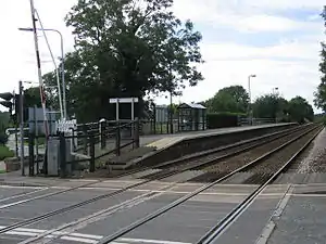 Habrough railway station serves the village of Habrough and the town of Immingham in North East Lincolnshire, England. It was built by the Great Grimsby and Sheffield Junction Railway in 1848. Up until 1988 there was a signal box at the station on the south side of the track and east side of the road with manually-operated gates. It was of typical Great Central Railway signal box design. The main buildings were located on the eastbound platform and were linked to the westbound one via a footbridge, but both have also been demolished and the level crossing was converted to an AHB (Automatic Half-Barrier) crossing. In 2015/2016, it was converted to a full-barrier level crossing with Obstacle Detection (MCB-OD).[1][2]
