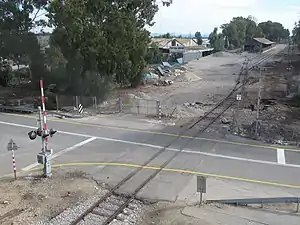 ![]() Station grounds in 2017. The level crossing is located on the old alignment of Highway 65. Visible next to the tracks is the abandoned citrus packing warehouse which underwent an extensive restoration in 2020. | |
