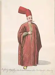 Although its administrative status in the early Ottoman centuries is unclear, by the 17th century Athens, though formally part of the Sanjak of Eğriboz (Negroponte, modern Chalkida) and hence ultimately under the jurisdiction of the Kapudan Pasha (the commander-in-chief of the Ottoman fleet), formed part of the vakıf of the Haramayn, the holy cities of Mecca and Medina, and was administered by the Kizlar Agha (the chief black eunuch of the Imperial Harem). Usually, however, its proceeds were rented out in a tax-farming arrangement to individuals, who then governed the city as its voivode.[14] The voivode or zabit (head of police) was appointed for annual tenures, beginning in March of each year. The post was lucrative, and voivodes generally tried to secure the renewal of their appointment. Bribes to the central government, but also the support of the local primates, were instrumental for the purpose.[15] The zabit was complemented by the mufti, the local Muslim religious leader, the kadi (judge, head of the sharia court), the serdar (military governor), and the dizdar (commander of the Acropolis of Athens).[4] In 1760, Athens became a malikhane, a special landed estate that belonged to the Sultan but was given to high officials as a usufruct estate that entitled its owner (malikhane sahib) to the collection of the tithe and other tax proceeds, in theory for life, in exchange for a lump sum and an annual rent. The owner often sub-let the proceeds to one or more third persons, who then held the post of voivode. The new system was to the detriment of the city, because the voivodes had an interest to maximize their gains in their short period of office, and because abuses were harder to redress: under the Kizlar Agha, the Athenians could address their concerns to a single person, close to the Sultan, but with the new system, there were several people who held authority, and the link to the Porte was more tenuous.[16][17][18] Furthermore, during the decades before Haseki's arrival in Athens, the zabit was in constant conflict with the pashas of Negroponte, who constantly sought to interfere in Athenian affairs.[19]