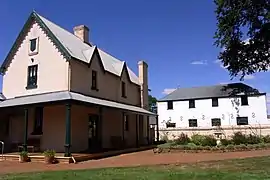 In early years there were two Hotels: Cricket Club Hotel near the river, which was partly destroyed by flood in the 1870s and subsequently demolished, and Hadspen Hotel, a convict-built sandstone structure.[12] By 1881 both had closed and there were no hotels in the town. An application to re-licence a building opposite the Wesleyan church was unsuccessful.[13] The Hadspen Hotel was a private home in the early 20th century[14] and remains as part of the town's heritage.[12] None of these hotels are open in the 21st century, the Rutherglen complex on the town's west is the only licensed premises.[15] There was a brewery in the town for a time, though it has long closed.[16] The postal service from Hadspen originally was handled by a licensee operating from a shop, and subsequently from one of hotels. By 1966 the post office was in a separate building on the site of the former blacksmith's shop.[17]