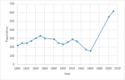 It has a population of 617 according to the 2011 Census. When analyzing the population graph, from 1961 to 2011 the population grew by 500 when comparing the data sets from the Neighborhood Statistics and the Vision of Britain website. However this large scale rise in population isn't truly valid as the two contrasting websites use different boundaries to outline Haile. The Neighborhood Statistics Census highlights Haile as a much larger area than the Vision of Britain site therefore explaining the massive change in population size.[5][1] This is because of the boundary change in April 1935 transferring an extra 45 acres to the area.[6] Therefore, both websites are accurate for the period they represent.