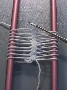 Hairpin lace is a lace-making technique that uses a crochet hook and two parallel metal rods held at the top and the bottom by removable bars. Historically, a metal U-shaped eponymous hairpin was used.