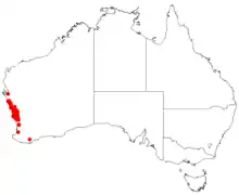 Hakea auriculata is endemic to areas along the west coast in the Wheatbelt and Mid West regions of Western Australia between Northampton and Gingin where it grows in sandy heaths and among stony hills and breakaways sometimes over laterite or granite.[3][9]